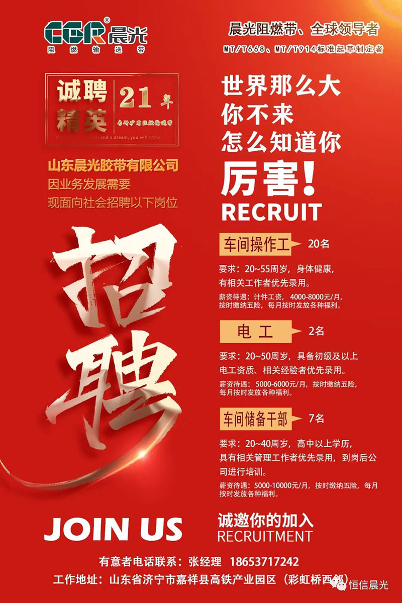 山東晨光膠帶有限公司開始招聘啦!公司成立于2003年,位于嘉祥縣萬張鎮(zhèn)高鐵產(chǎn)業(yè)園,專研阻燃輸送帶21年,公司擁有一支高素質(zhì)的員工隊伍,連續(xù)多年被評為國家級高新技術(shù)企業(yè),省級企業(yè)技術(shù)中心。 ?