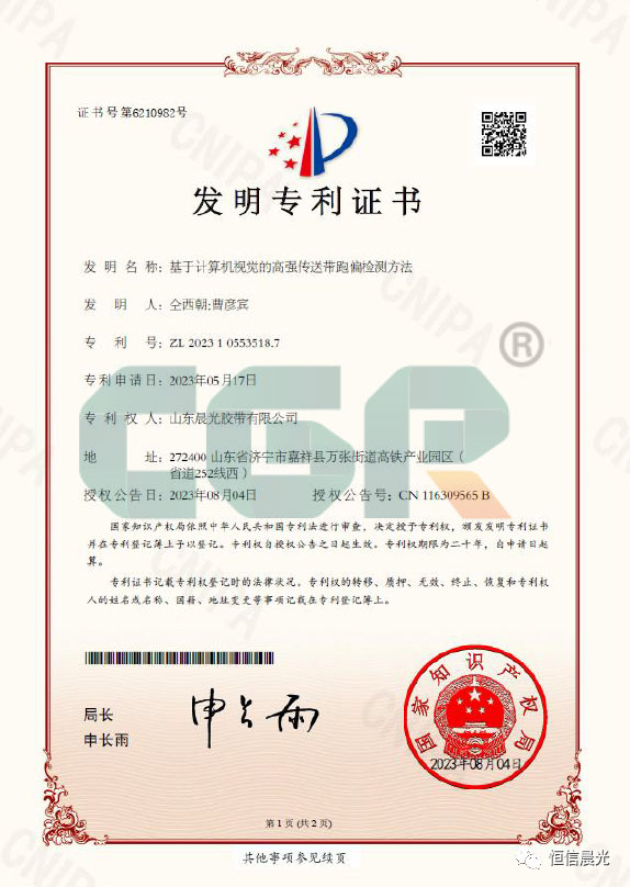 2023年08月04日,山東晨光膠帶有限公司新增獲兩項發明專利。“基于計算機視覺的高強傳送帶跑偏檢測方法”、“一種高強傳送帶物料智能檢測方法及系統”。